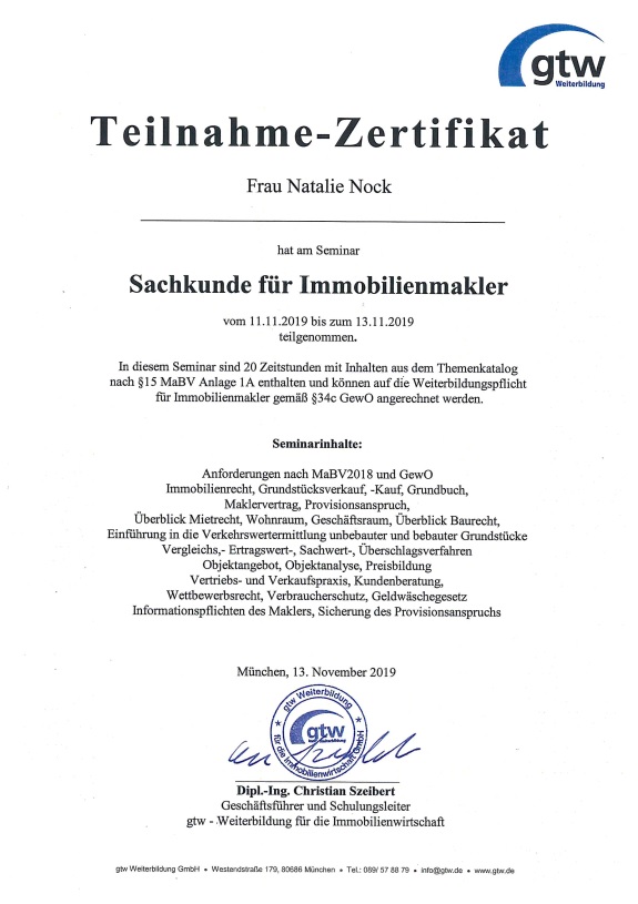 Seit November 2017 bin ich selbstständige Immobilienmaklerin mit eigener Firma, namens Nock Immobilien / Inh. Natalie Nock